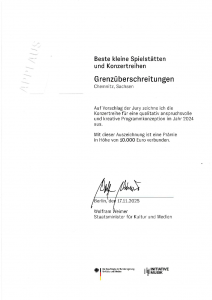 Wir wurden mit dem APPLAUS-Award 2025 in der Kategorie „Beste kleine Spielstätten und Konzertreihen“ ausgezeichnet. Dazu waren wir am 17. November 2025 in München in der Muffathalle, um dort von Kultursstaatsminister Wolfram Weimer den Preis entgegen zu nehmen.
