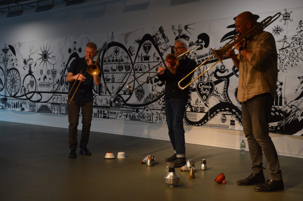 Dieses Trio aus den Posaunisten Jeb Bishop, Matthias Müller und Matthias Muche spielt Musik, die von Klangskulpturen-Geräuschdrohnen über einstürzende Mauern von Jericho bis hin zu zarten Luft- und Tongeflechten reicht, die Obertöne mit vielschichtigen Artikulationen resonieren. Die Musiker brachten die akustischen Eigenschaften des Instruments und die Körperlichkeit der Spieler bis an ihre Grenzen und darüber hinaus, indem sie ihr archaisches Gerät durch die Knochenmühle schickten, es pulverisierten, sublimierten und ihm neues Leben einhauchten, ganz im Geiste von Vinko Globokar beachten sie, dass ein Musikinstrument kein unantastbarer Gegenstand, sondern lediglich eine Erweiterung des Körpers ist.